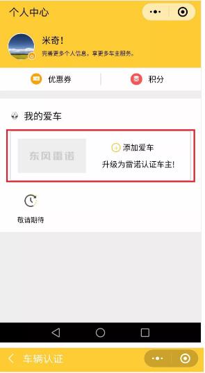 返回東風(fēng)雷諾車(chē)友會(huì)主頁(yè)面,點(diǎn)擊左下角菜單欄【個(gè)人中心】,進(jìn)入車(chē)主認(rèn)證通道。
